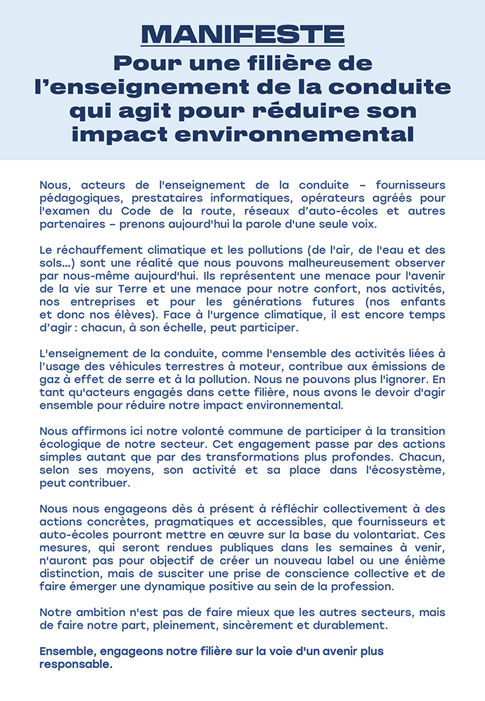 Nous faisons donc partie des 16 acteurs du secteur de l'enseignement de la conduite, qui avons choisi d'unir nos forces pour accompagner activement la transition écologique de notre secteur d'activité.