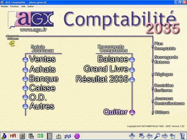 En bas à gauche, de couleur bleu, se situent les accès aux fonctions propres aux modules telles que la construction du grand livre ou de la balance, les impressions, etc.
